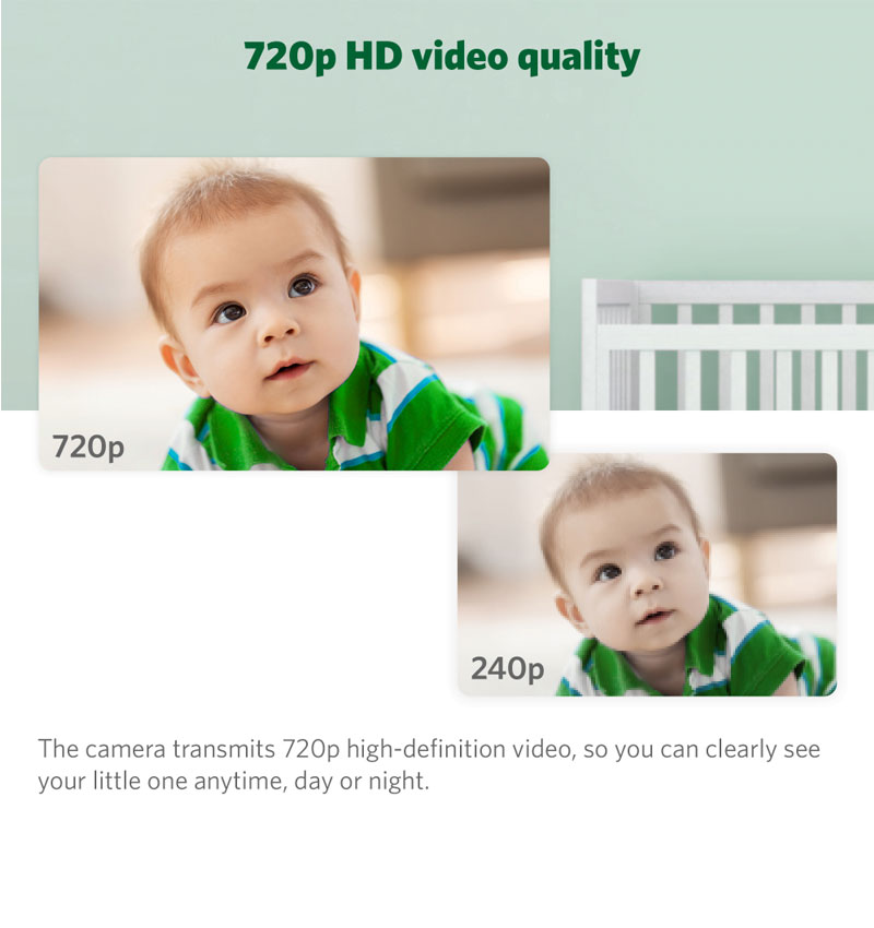 The camera provides up to 8 times zoom video, so you can clearly see your little one wriggling around in HD video from the parent unit, a smartphone, or a tablet.