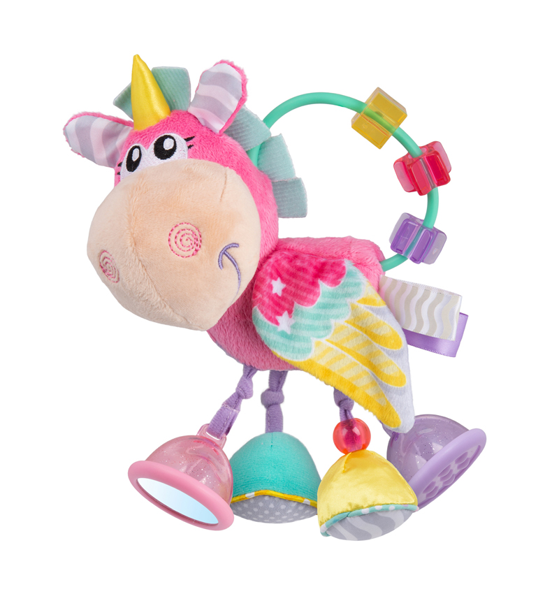 Unicorn magic and activity fun! This adorable interactive rattle will keep little ones entertained whilst stimulating sensory development. Fine motor skills too are enhanced as baby explores the variety of beads, rattles, textures and shapes. Lifting the peek-a-boo wing reveals a reflective metallic fabric on the underside, engaging curiosity and imagination. Two colourful glitter hooves feature a see through rattle for sensory stimulation and a mirror to reflect baby’s image and teach self awareness. Textured beads on the handle are perfect for soothing sore gums. Simply add a clip to secure Unicorn to the pram or car seat and take the fun with you!
