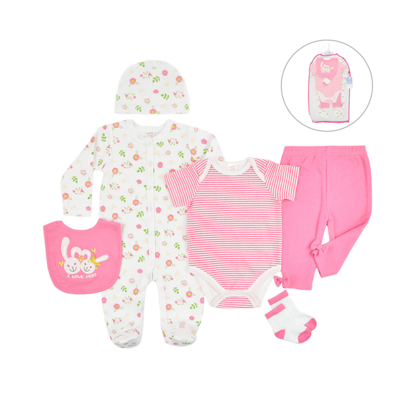 Our Baby Gift Set of 6 Pieces is the perfect choice for newborns and babies, offering a complete ensemble of clothes ideal for birthdays or baby showers. Each piece ensures comfort and softness against delicate skin. Packaged in its own gift bag, this set includes a one-piece bodysuit with convenient buttons, a short-sleeved t-shirt, trousers, socks, bib, and a hat.