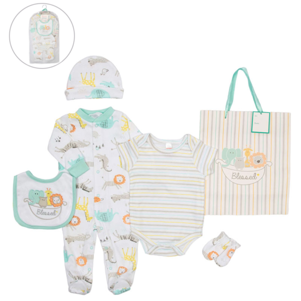 Our Baby Gift Set of 6 Pieces is the perfect choice for newborns and babies, offering a complete ensemble of clothes ideal for birthdays or baby showers. Each piece ensures comfort and softness against delicate skin. Packaged in its own gift bag, this set includes a one-piece bodysuit with convenient buttons, a short-sleeved t-shirt, trousers, socks, bib, and a hat.