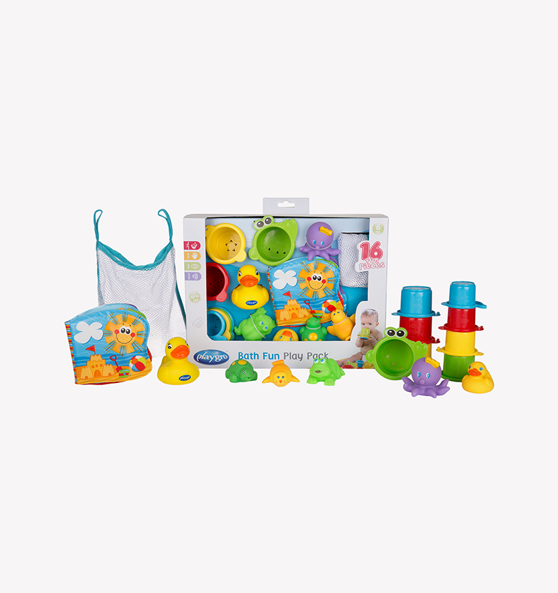 15 fun bath pieces in 1 fantastic gift pack! The Bath Fun Play Pack will entertain and delight baby in the bath with stacking cups, a waterproof book, squirties and the beloved bath duckie. This pack is the ideal gift for babies beginning to enjoy bath time offering vibrant colors, varied textures and delightful sounds.