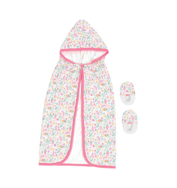 This Bath Set includes a soft fabric bath cape and a pair of slippers. This set is made to keep your baby warm and dry when they are finished with bath time.