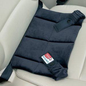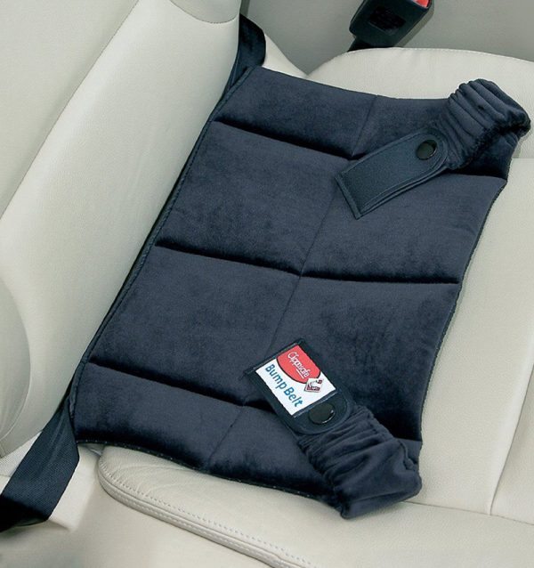 Mum-to-be sits on the Bump Belt’s seat pad and fastens the vehicle seat belt as normal, making sure the lap part is underneath her baby bump. The two elasticated flaps of the Bump Belt are then easily secured over the lap section of the seat belt. This secures the lap belt under the baby hump and prevents it from riding up over the belly.