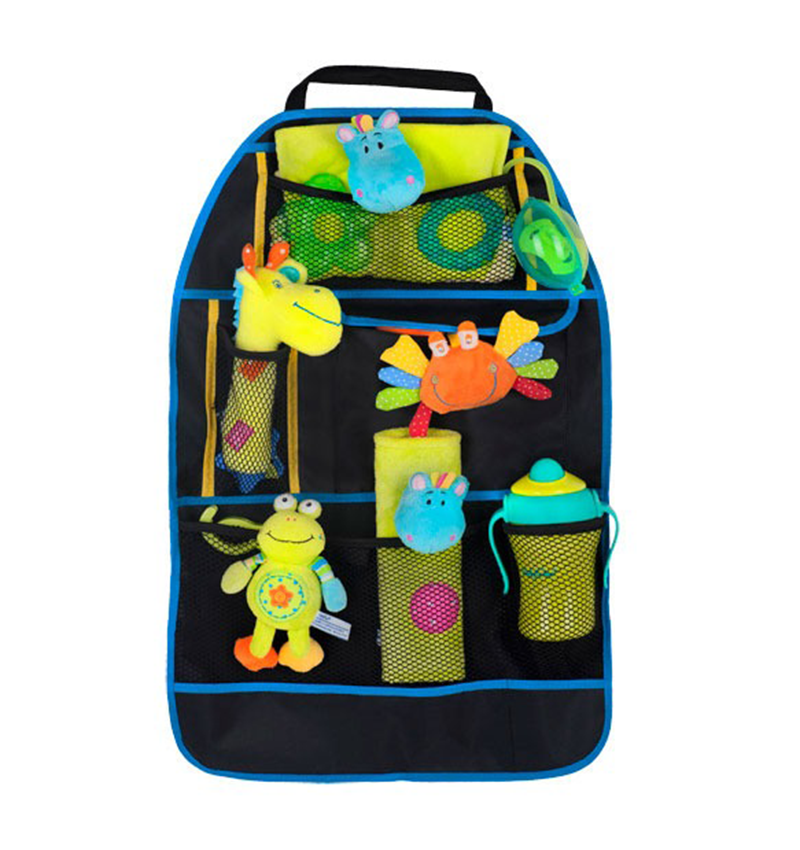 The car seat organizer contains pockets and compartments to be used to store toys, bottles and other accessories.