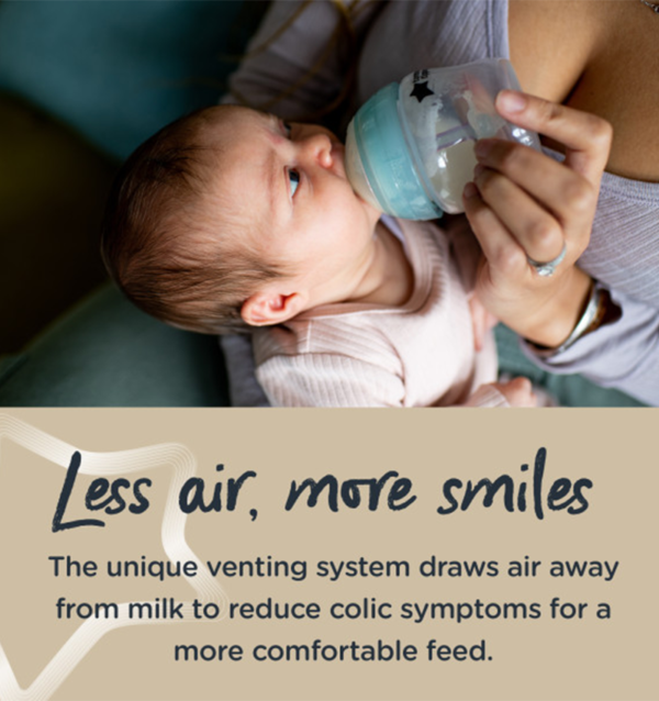 The unique anti-colic venting system on our Advanced anti-colic bottle draws air away from milk, meaning 80% fewer colic symptoms such as wind, reflux and fussing.