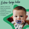 Large holes in the soother shield also allow more air to flow through it, so that baby’s skin can breathe. This helps keep their mouth, nose and cheeks dry and free from moisture, and so prevents any skin irritation.
