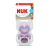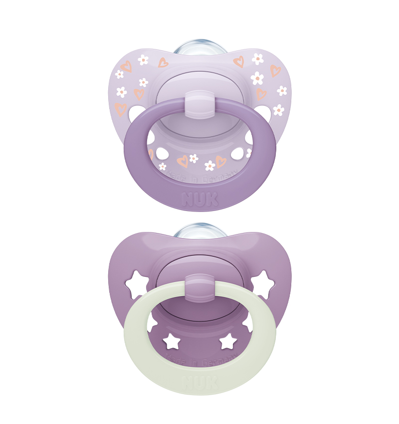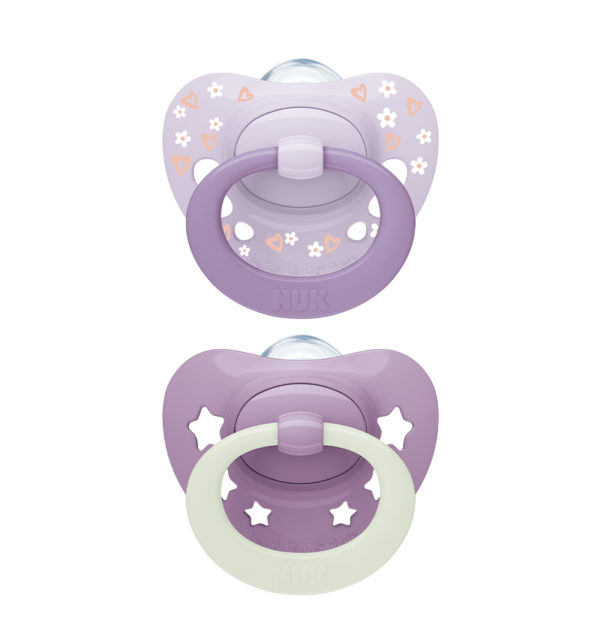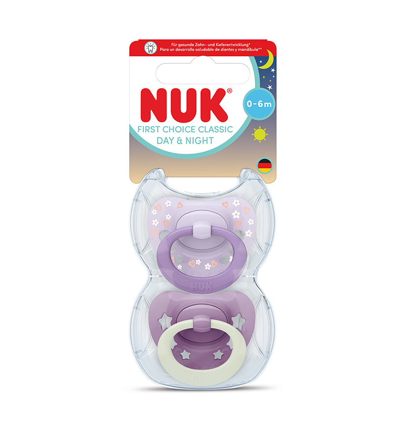 NUK Soothers have an orthodontic shape that promotes healthy oral development.  Features a Classic Day & Night design.