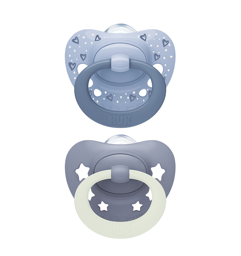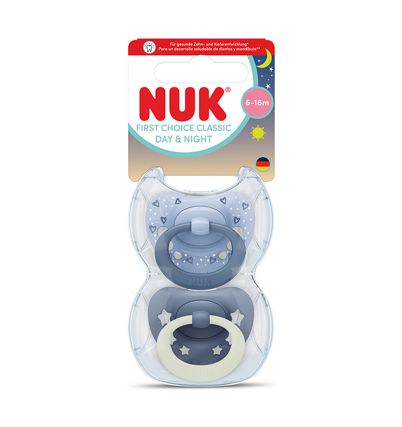 NUK Soothers have an orthodontic shape that promotes healthy oral development.  Features a classic Day & Night design.