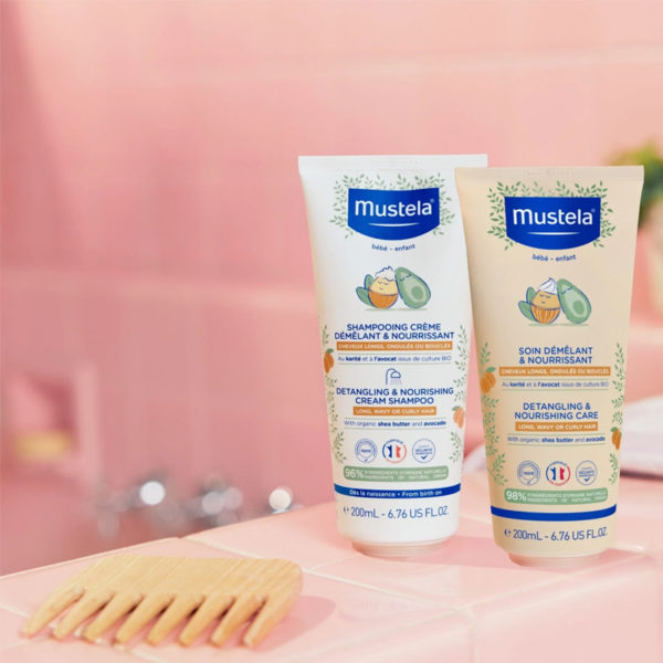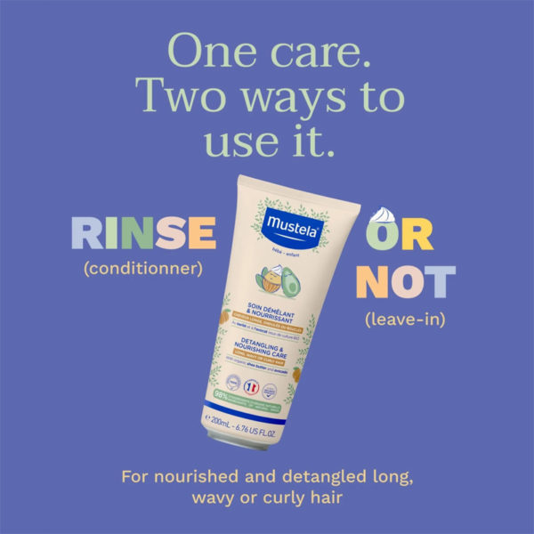 Mustela Detangling Nourishing Care Conditioner gently softens and smooths delicate hair. Enriched with natural avocado and plant-based ingredients, it makes combing effortless while keeping hair healthy, shiny, and tangle-free. Its ultra-gentle, lightweight formula is safe for daily use from birth*, leaving hair lightly scented, hydrated, and easy to manage.