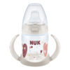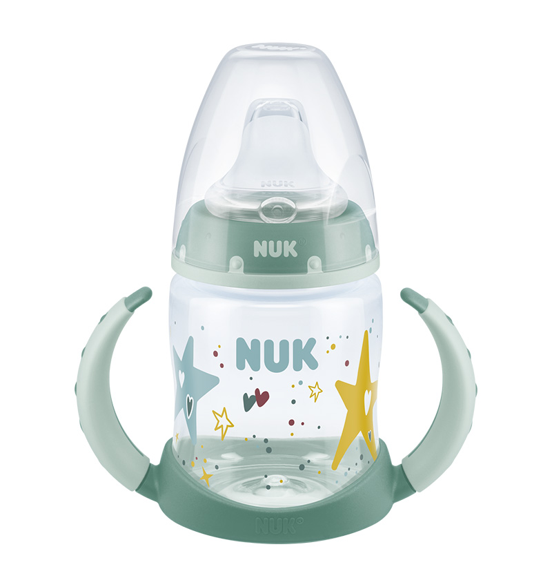 The NUK First Choice Learner Bottle can hold up to 150ml and comes with NUK ergonomic handles.
