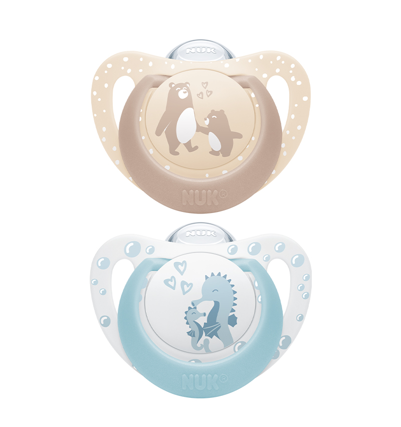 NUK Soothers have an orthodontic shape that promotes healthy oral development.  Features a Bear and Seahorse character design.