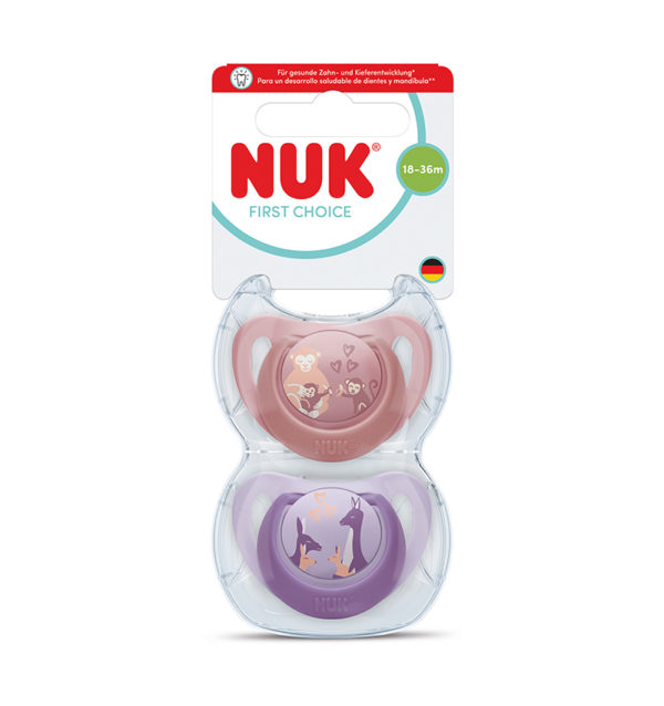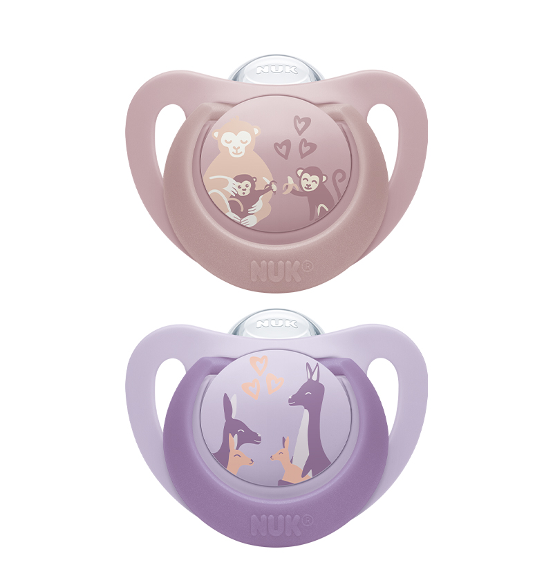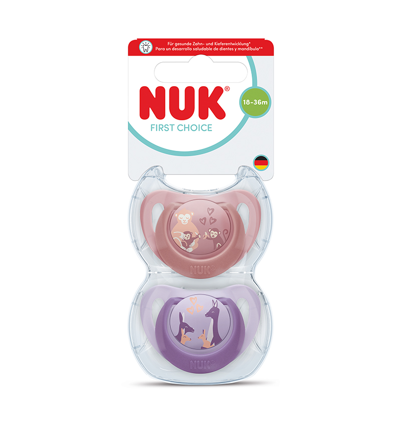 NUK Soothers have an orthodontic shape that promotes healthy oral development.  Features a Monkey & Kangaroo character design.