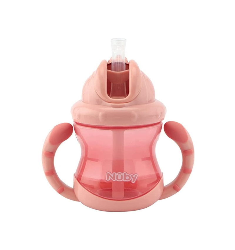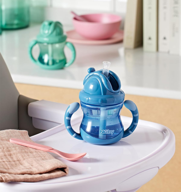 The drinking straw has a built-in drinking valve, which only lets liquids through if your child puts pressure on it. This Vari-Flo system allows your child to determine the drinking flow themselves. The locking flap keeps the straw clean when not in use. The handles make the transition from the bottle to the drinking cup easier.