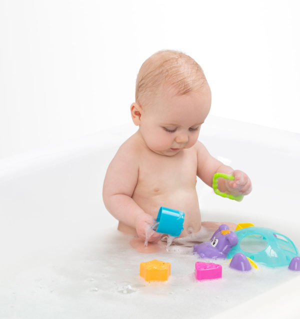 • Floating hippo features shape sorter fun, supporting cognitive development