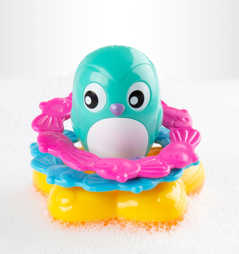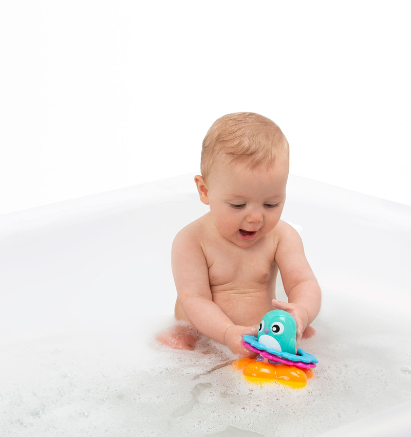 Fun in the tub starts here with the Float and Toss Ring Stacker! Baby’s bathtime friend, this adorable floating Penguin with detachable base features two colourful textured rings for baby to stack and toss. Perfect for assisting baby’s motor skills and encouraging baby to explore their water environment, the stack and toss action supports cognitive development and engages hand eye coordination. Bright fresh colours pop, stimulating baby’s visual perception and textured surfaces engage baby’s tactile senses.