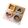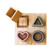 • The set contains 4 pieces of different shapes and colours and a wooden board with matching indents for sorting the shapes.