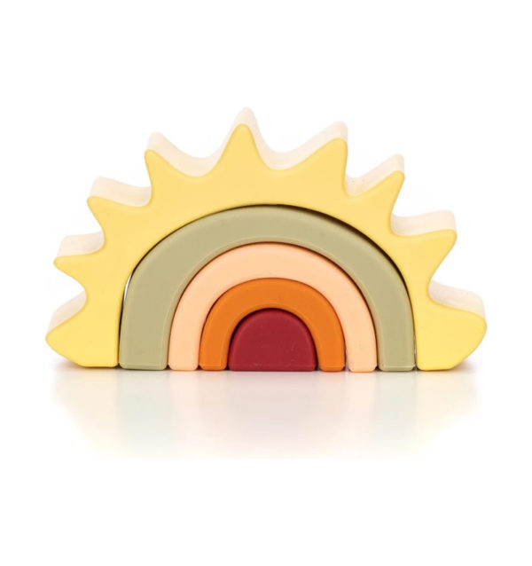 • The set contains 5 different silicone building blocks that can be stacked on top of each other/into each other/behind each other. Each building block is of different colour and size.