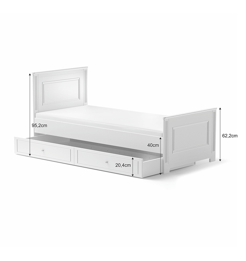 • The bed takes a mattress size of 90×200 cm. The drawer takes a standard mattress size of 90x190x14