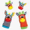 • Simply slip the sock-like foot finders onto baby’s feet and use the Velcro straps to secure the wrist rattles.