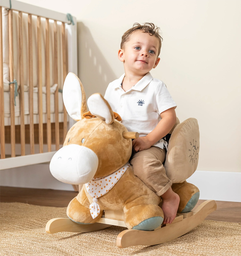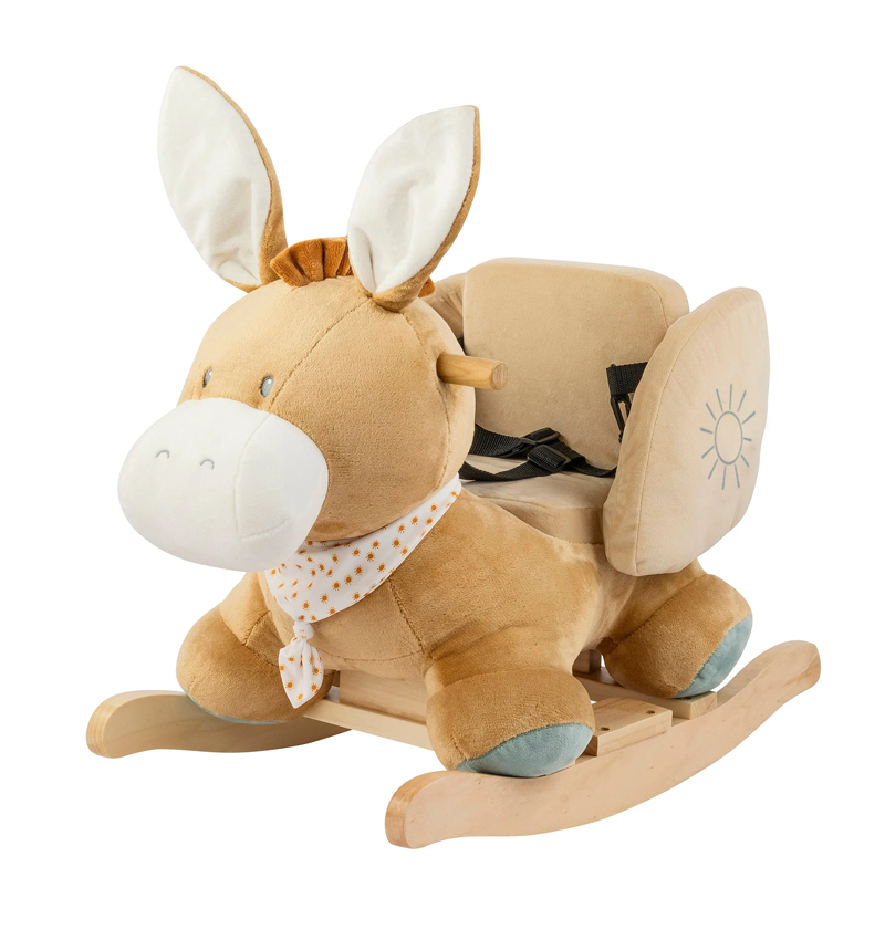 Leo the donkey rocking horse is the ideal playmate for your child and a real eye-catcher in any baby room. The rocking horse features a seat with soft padding and side supports that completely surround your child’s body. The wooden handles are designed for small hands. Leo’s adorable face, soft ears, and captivating mane are beloved by curious little hands. The wide base and footrests provide extra stability. Together with Leo the donkey, your child will enjoy hours of rocking fun and playfully train their sense of balance.