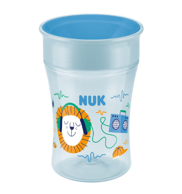 The NUK Magic Cup allows children to drink in the same way as adults do. The 360° drinking rim encourages and allows drinking from any side, without any handles much like a normal drinking cup. The “magical” difference is that the cup cannot leak. A silicone disc seals the lid from the inside. To drink a child has to suck on the rim to open the seal.