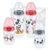 • Including 4 NUK Disney Mickey FIRST CHOICE+ wide neck baby bottles (2 x 150 ml with silicone teat size 1 M, 2 x 300 ml with silicone teat size 1 S) made of polypropylene (PP), Bisphenol-A free