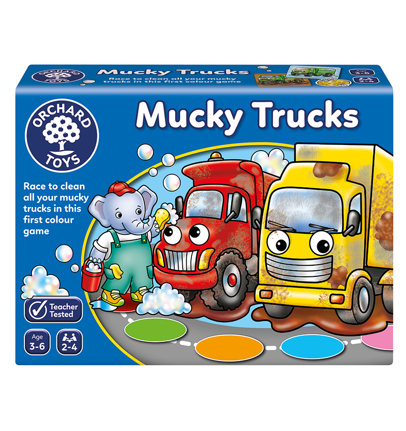 Players race to be the first to get their mucky trucks clean! Roll the dice and move the elephant playing piece around the car wash playing board. Land on a colour, and make your corresponding coloured truck sparkly clean – land on a mud splat and bad luck, your truck becomes dirty again!