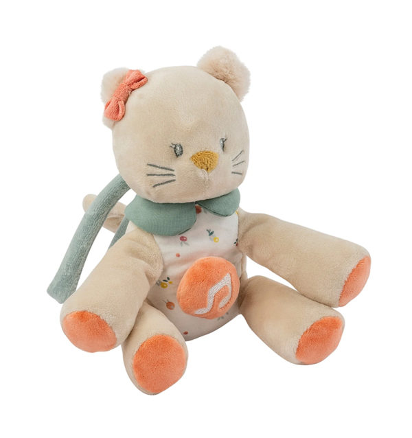 The Nattou musical cuddly cat Lana features a built-in music box that plays a gentle “La-Le-Lu” melody. Designed to stimulate gripping reflexes, it’s made with soft, fluffy fur for easy cuddling. Perfect for your baby’s playtime and comfort.