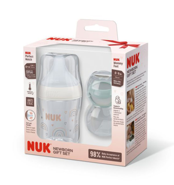 Perfectly designed for your newborn, this set includes a NUK Perfect Match Bottle and two NUK MommyFeel Silicone Soothers, all packed in a handy reusable transport box. Ideal for feeding and soothing, this set provides everything your baby needs for comfort and care.