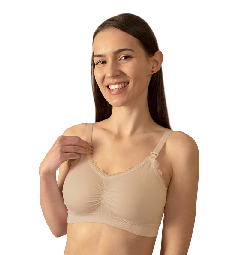 This elegant nursing bra is designed to provide both comfort and style. Made from unique antibacterial fibres, it features a subtle lace detail for a decorative touch. The bra is free from constricting underwires, offering ultimate comfort and seamless support. Its flexible, seamless design adapts to any figure, ensuring a perfect fit without exerting pressure, making it an ideal choice for nursing mothers.