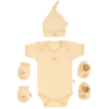 This set includes: 1 pair of mittens, 1 pair of shoes, 1 cap & 1 bodysuit.