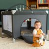 Playpen with zipped door and toy bar, travel cot-way folding, from birth.