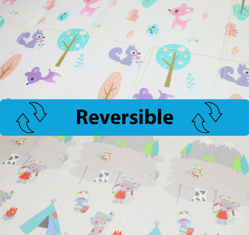 This baby playmat is foldable & reversible with different designs on each side. Its lively and bright colours encourage young children to play.