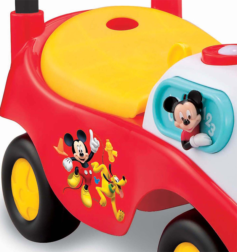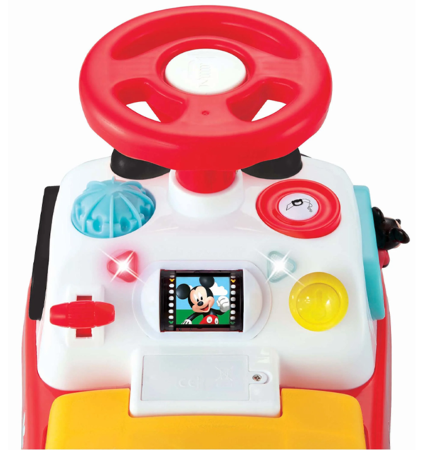A delightful vehicle inspired by your favorite characters. Have your kids take a ride with lights and sounds Mickey. This bright and colorful vehicle has all sorts of hands-on play additions. Dashboard has fun and colorful interactive electronic activities.