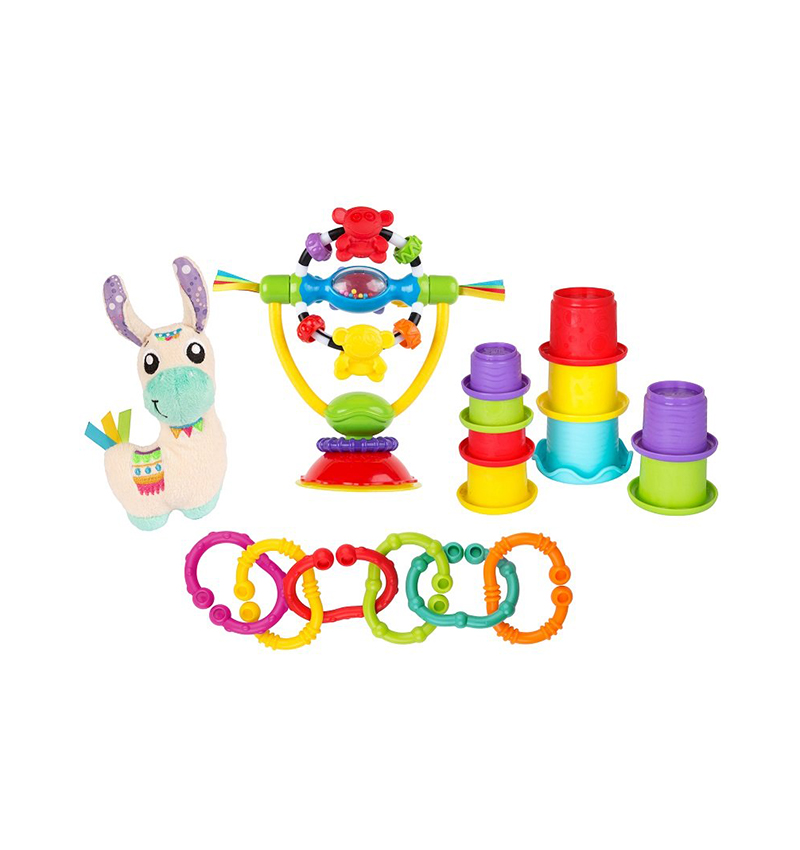 This gift set offers opportunities for your child to discover and learn. It is an ideal gift because of its versatility. The pack includes toys that stimulate both tactile and visual development.