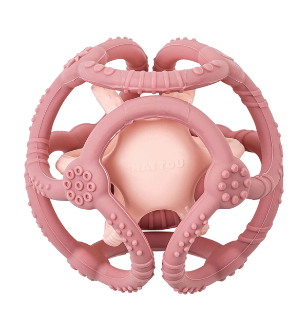 The two-coloured silicone balls are both a teething ring and a rattle. The holes and different textures are fun to play with and help develop a sense of touch.