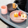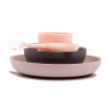 Silicone meal box consisting of a plate and a bowl with a suction cup, a cup, and a 1st age spoon, all with mix & match colors.