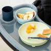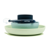 Silicone meal box consisting of a plate and a bowl with a suction cup, a cup, and a 1st age spoon, all with mix & match colors.
