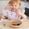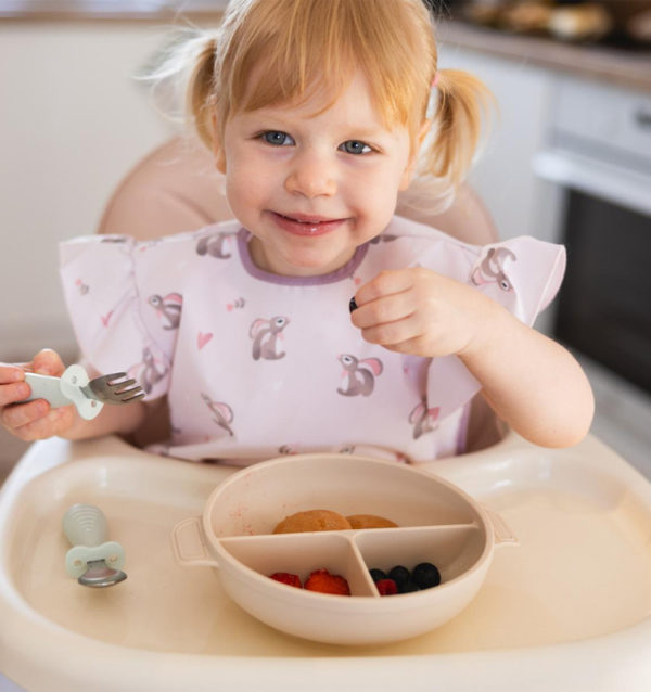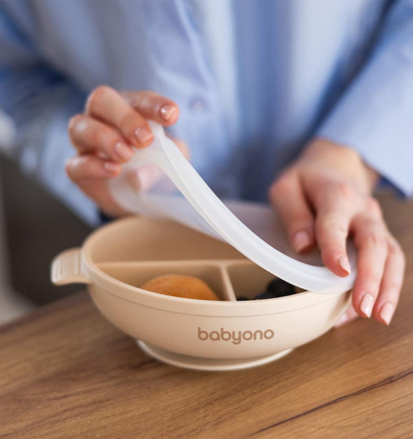 A three-compartment plate with sucker and lid by Babyono proves supportive while introducing solids into your baby’s diet, especially using a BLW method. It introduces new flavours, fosters self-feeding and prevents a mess.