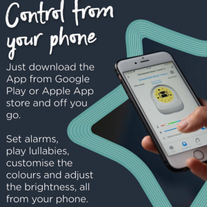 You can control everything from a clever app on your phone, or manually on the clock itself. You can set alarms for sleep and naps, change sounds and music and even dim the clock face for sleep time.