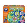 Players start with a selection of five green slime cards. Taking it in turns they choose a purple slime card – if the card rhymes with one of the cards in front of them, the player must think of a silly sentence using the two words. Once they have a rhyming sentence they spin the spinner to find out in what style they must say their silly sentence in: whilst either holding their nose, with their teeth together, or in a squeaky voice!