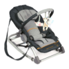 Multi-adjustable stationary or rocking position baby seat that can be used from birth and can easily be folded and reclined with one hand.