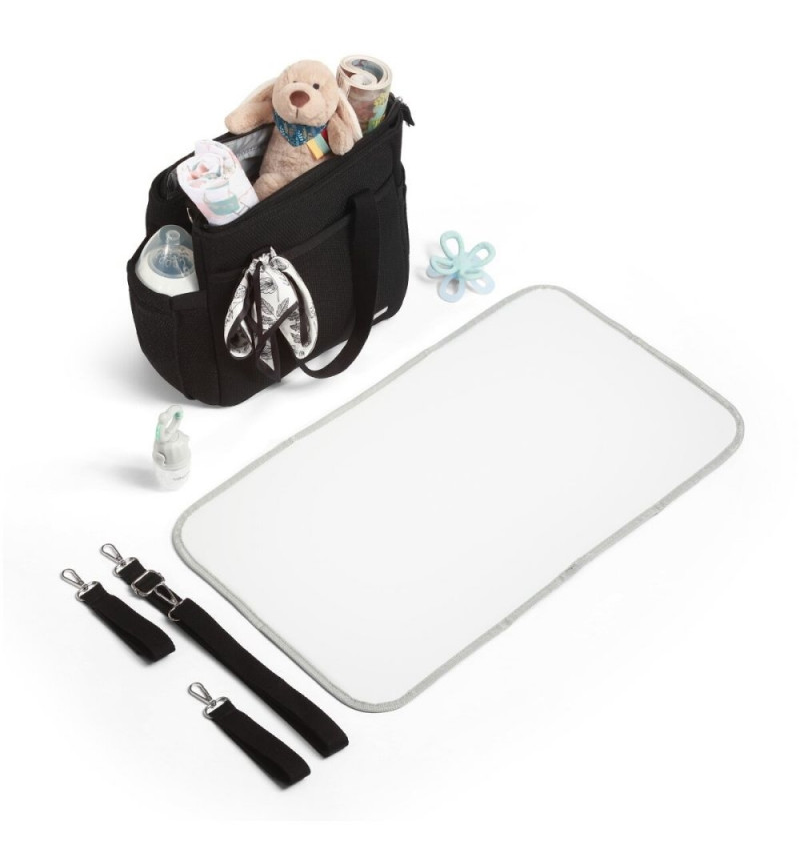 The interior of the bag conceals 9 handy pockets, a changing mat, a key/teat leash.