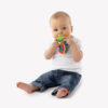 The bright engaging shapes of the Textured Teething Rattle are sure to entice baby. The soft chewy textured shapes are ideal for soothing sore gums, while click-clack sounds can be heard when shaken – perfect for auditory stimulation.
