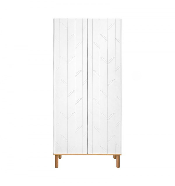 The wardrobe is divided in three sections – to the left side, there is one adjustable shelf and two hanger rail and, to the right, there are adjustable shelves, while section comprises of a drawer equipped with the “push to open” system.