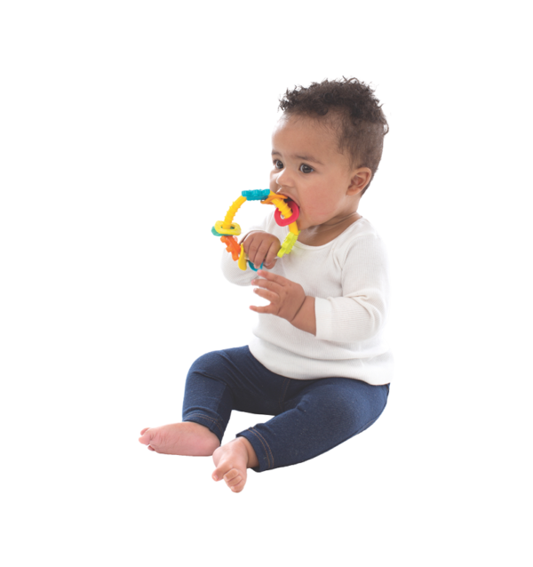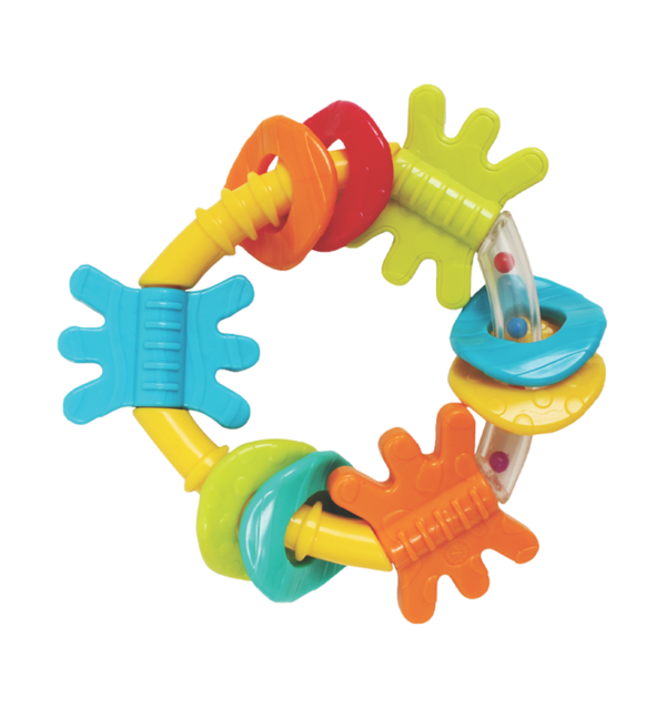 Watch baby’s delight as they rattle and shake the triangle teether! Featuring spinning paddles for practicing fine motor skills and rattling beads for auditory stimulation. The textured surfaces are perfect for little hands to explore and develop their tactile skills.