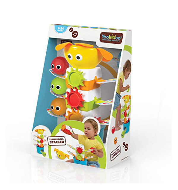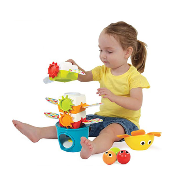 Featuring five large, colorful stackers, each with its own gear activity, a flower funnel head with soft petals and crinkly wings, and 3 rattling balls to drop down the center, this toy is a developmental must-have. Watch your toddler’s delight as they drop the balls down the funnel head and the crinkly wings flap as the balls pass through. The best part – the balls randomly exit from one of the two openings!