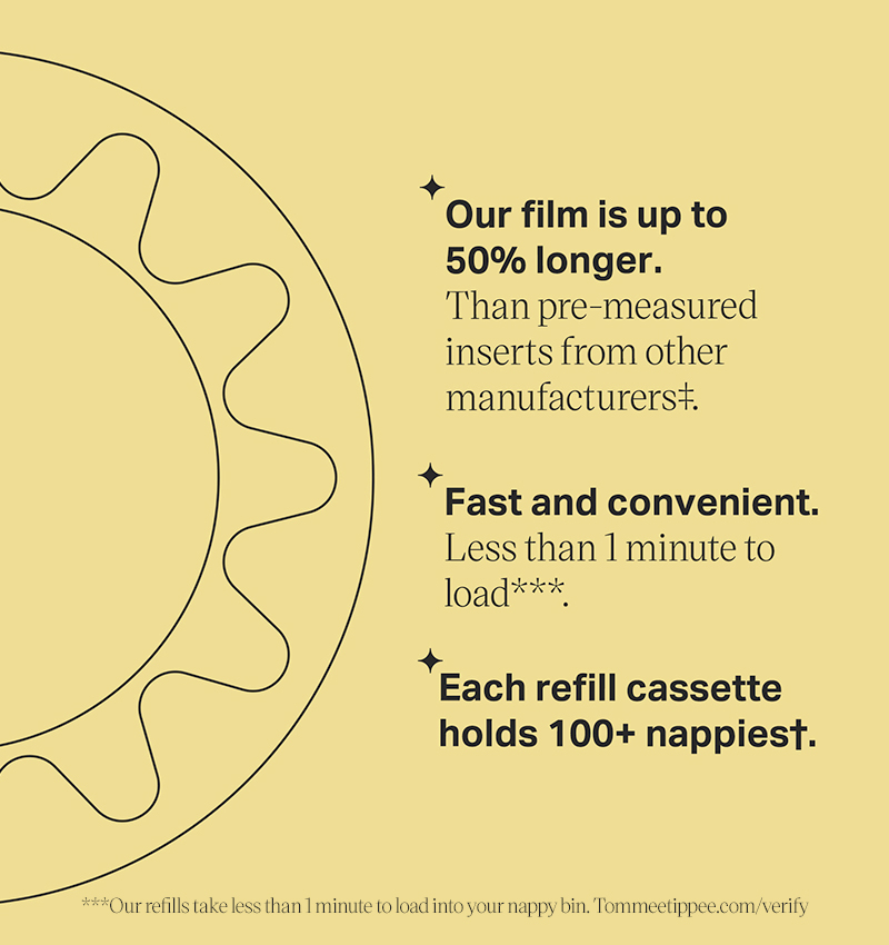 • The twist and click system ensures that each nappy is individually wrapped in the optimum amount of anti-bacterial film, meaning less waste.