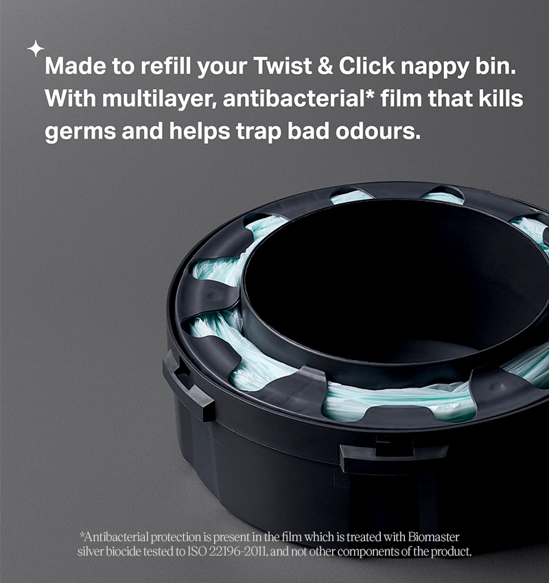 • Now more eco-friendly: The Twist & Click nappy bin and refill cassettes are made from 98% recycled and fully recyclable plastic. Our multi-layer antibacterial film is now bio-based and made from sustainably sourced sugar cane greenfilm.