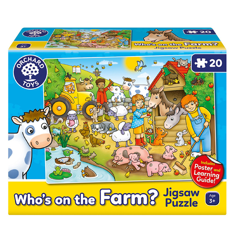 Who’s On The Farm includes a bright poster and a fun learning guide inside, which features different discussion points to talk about and encourage observation once the puzzle has been completed such as; counting the yellow chicks, spotting the stripy sock and asking what is a baby duck called?
